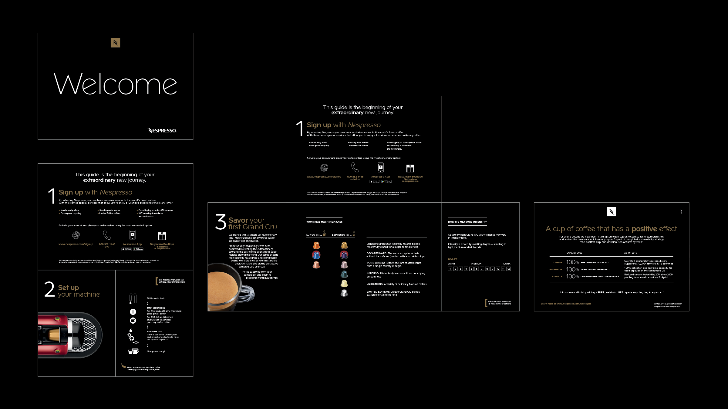 Quick Start Guide for Nespresso. Cover and brochure opened once; continuation of brochure opening; back cover